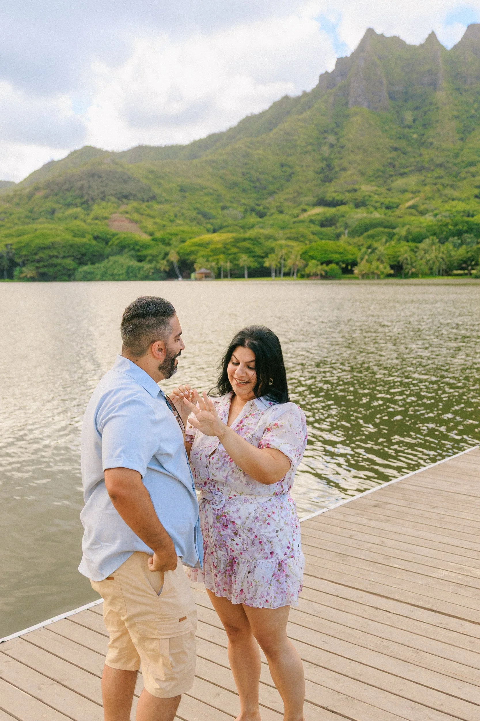 The day began with a private boat ride across the fishponds—already romantic enough on its own. Tanya thought they were simply taking a tour, but as the boat docked at Secret Island, Art had a much bigger plan in mind. As the sun dipped lower over the Koolau Mountains, he got down on one knee and asked Tanya to marry him. Her reaction? Pure joy, laughter, and tears.